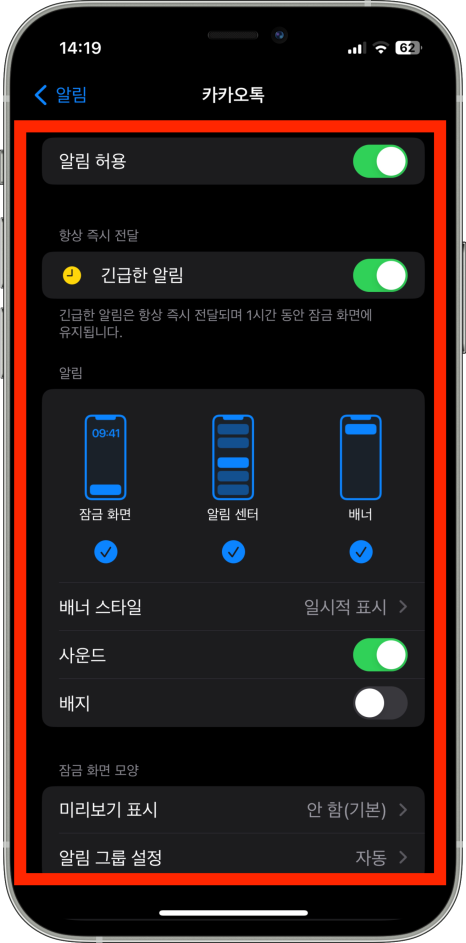 카카오톡 메시지가 안 온다면, 아이폰 '설정'에서 '알림'을 확인해보세요. 카카오톡 알림이 허용되어 있는지 확인하고, 허용이 안 되어 있다면 허용으로 바꿔주세요.