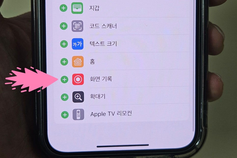 3. 이어서 맨 밑으로 내려주면 마지막 쯤에 [화면 기록]이라고 적힌 칸이 있습니다. 왼쪽에 있는 [+] 버튼을 눌러주세요.