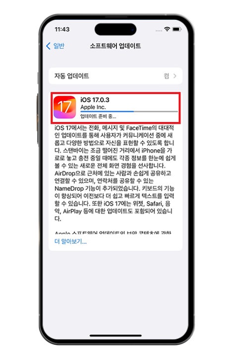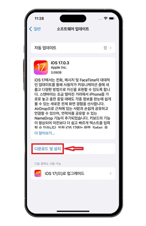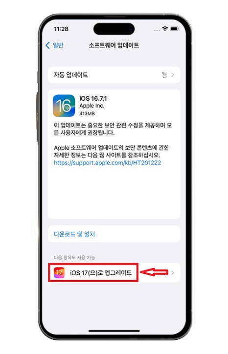 소프트웨어 업그레이드 항목으로 오시게 되시면 기존에 사용하는 버전과 아래에 다음 항목도 사용 가능 이라는 내용 및에 보시면 "iOS 17(으)로 업그레이드" 버튼이 있습니다. 선택해서 이동해 주세요.