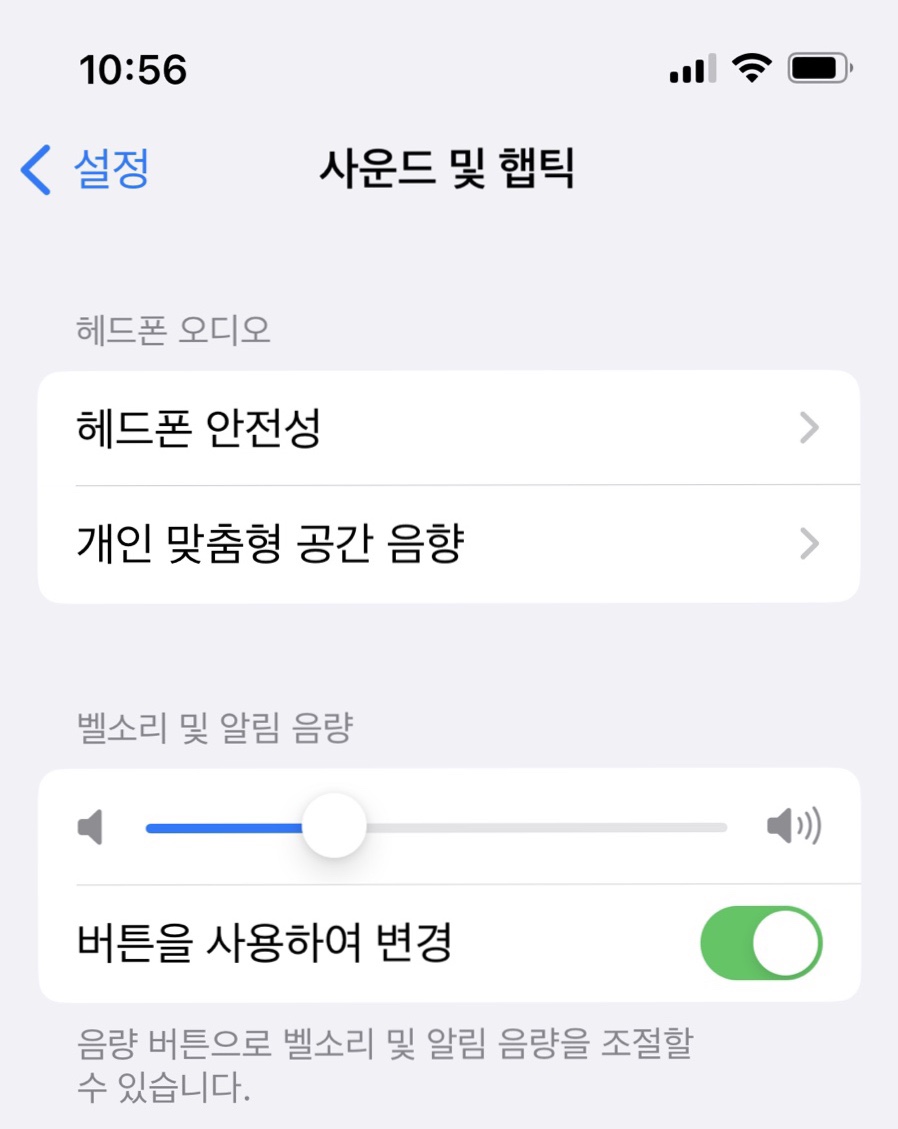 결국은 설정의 사운드 및 햅틱에서 벨소리 및 알림음량의 ‘버튼을 사용하여 변경’을 초록색표시로 바꿨더니 줄이어폰의 버튼이 드디어 인식이 되었다.
