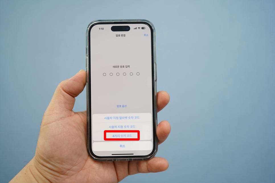 새로운 암호 입력 페이지가 나오면서 암호 옵션을 선택할 수 있는 항목이 있는데 여길 터치하면 새롭게 지정할 수 있는 3가지 암호 옵션 팝업창을 볼 수 있습니다. 맨 아래에 있는 4자리 숫자 코드를 선택하면 아이폰 비밀번호가 4자리로 지정됩니다.