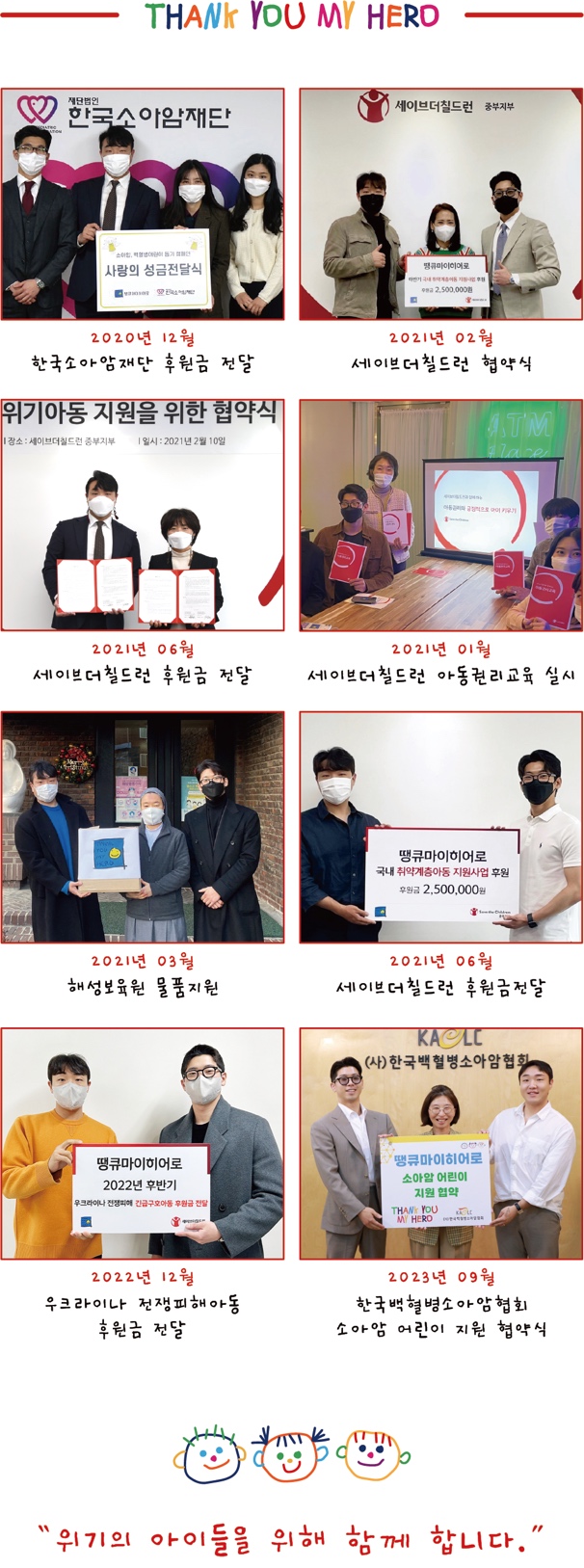 땡큐마이히어로는 한국 소아암 재단, 세계적 NGO 세이브더칠드런과 공식 업무협약한 브랜드이다.