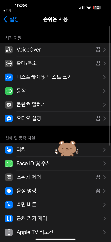 손쉬운 사용의 여러 항목들 중, 저희는 터치에 들어가줄 겁니다.