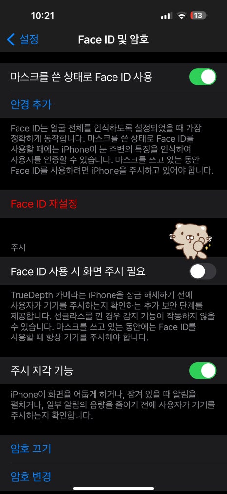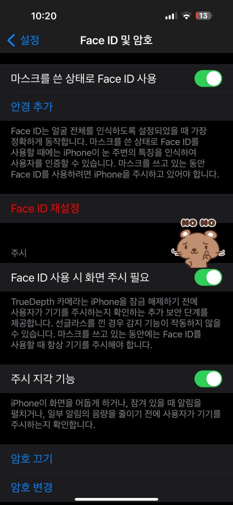 아이폰 보안설정 화면 주시 기능 미션 클리어!!