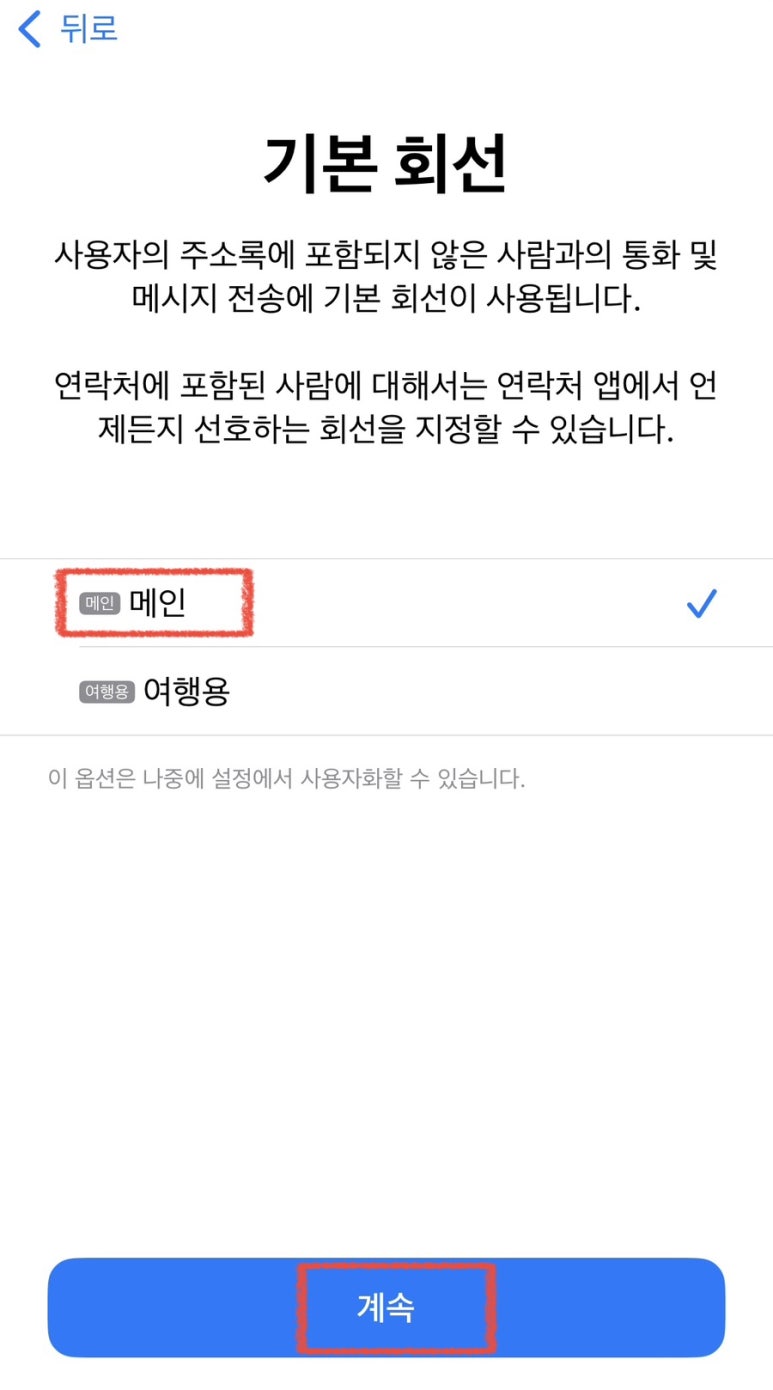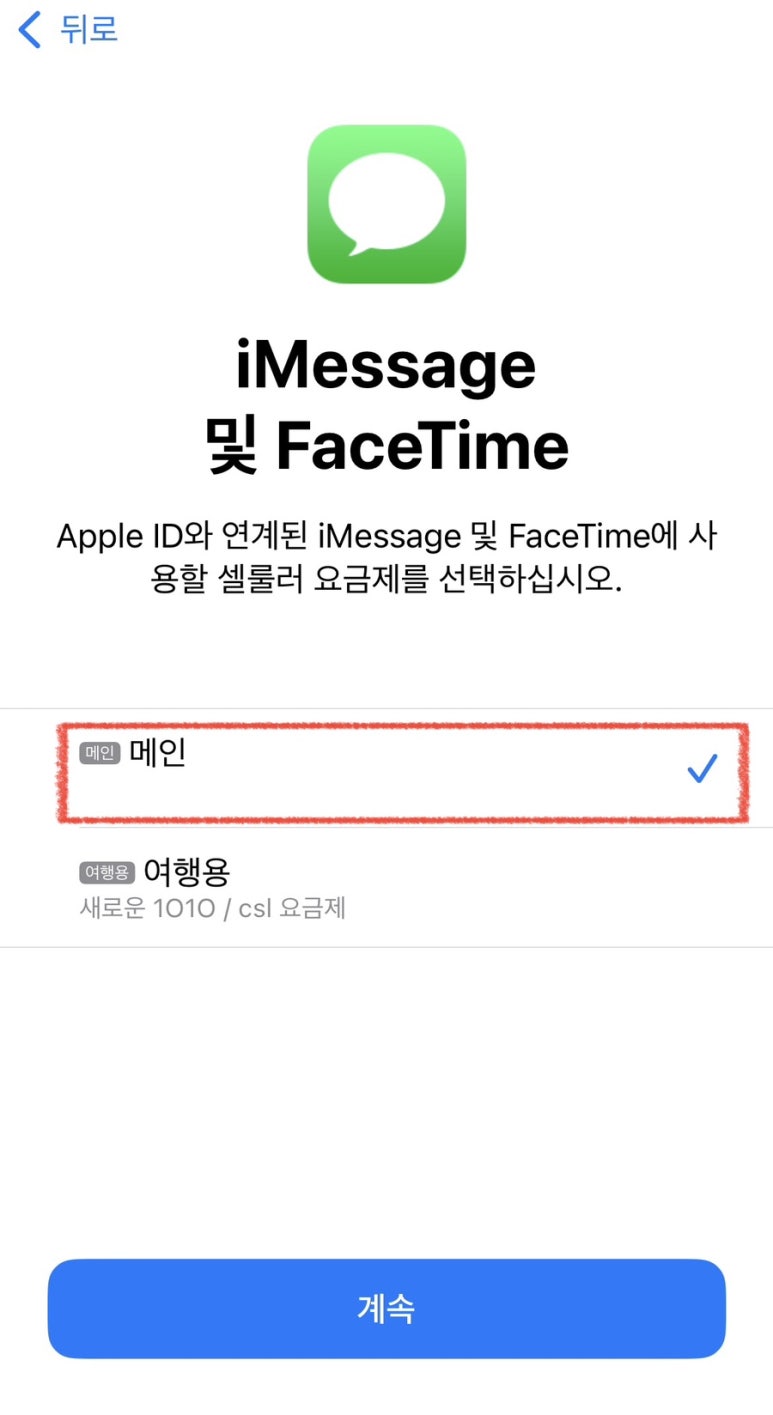 한국에서 설정하고 있는 상태이므로, 기본회선은 메인(한국 회선)을 선택해 주시고, iMessage 및 Facetime도 메인(한국 회선)을 선택해 주세요.