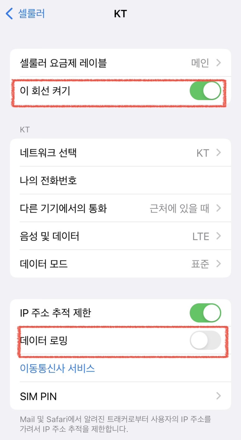한국 메인 회선에서 데이터 로밍 OFF, 이 회선 켜기 ON으로 설정해 주세요.