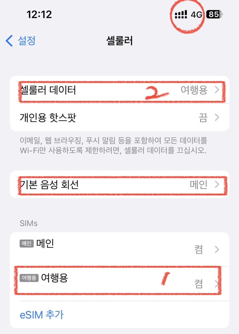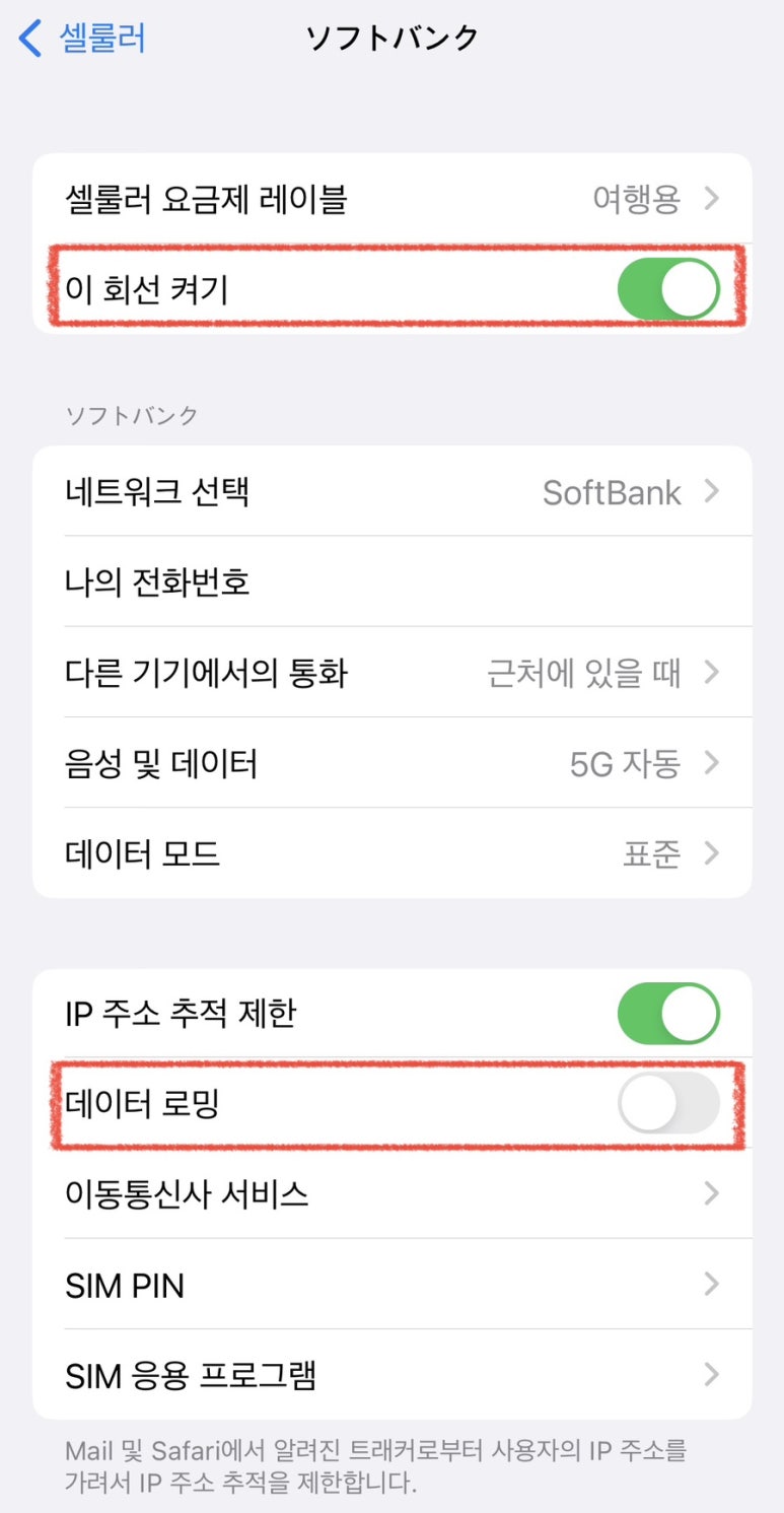 위 그림과 같이 SIMs에서 여행용의 이 회선 켜기를 해주시고, 셀룰러 데이터를 여행용으로 바꿔주시면 됩니다.