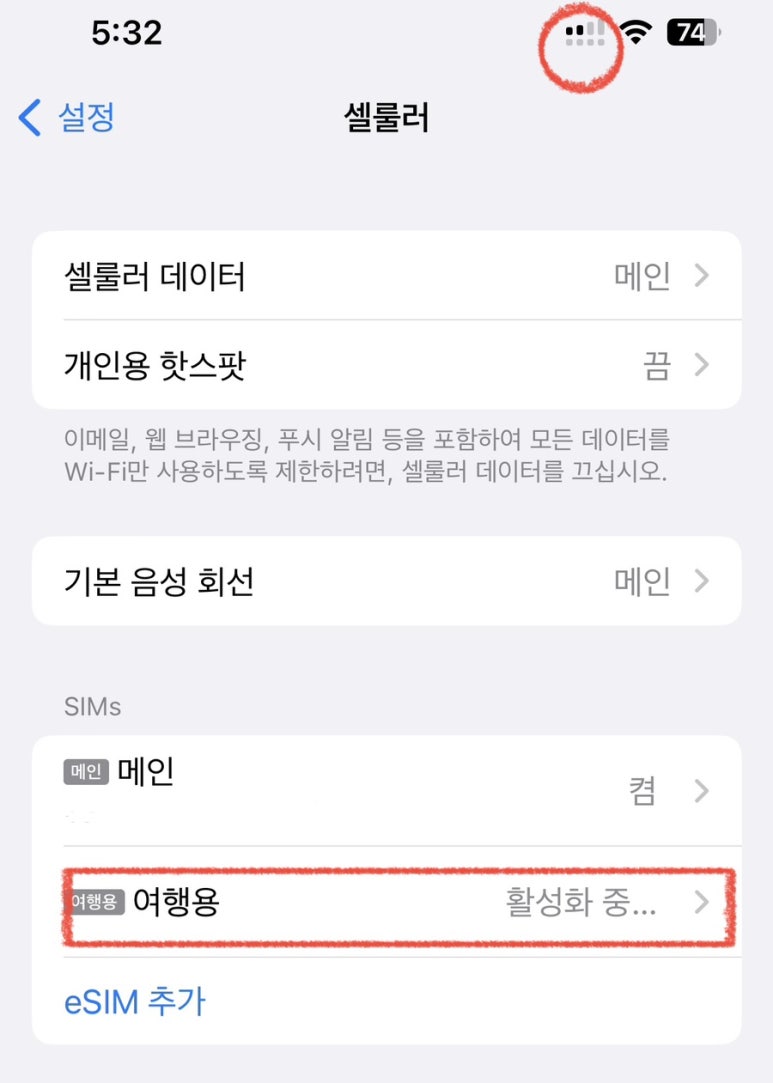 셀룰러에 들어가서 보시면, 셀룰러 데이터 - 메인, 기본 음성 회선 - 메인, 메인 - 켬, 여행용 eSIM - 끔으로 설정하셨다면 한국에서 설정해야 할 사항은 완료했습니다.