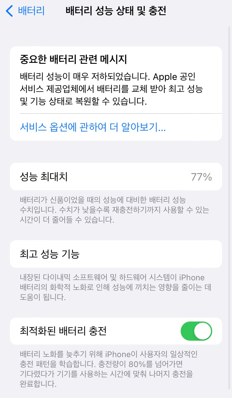 전력이 부족하신가요? 가까운 Apple Store 또는 공인 서비스 제공업체를 방문하시면 iPhone 배터리를 교체 받으실 수 있습니다. 보증 유형에 따른 관련 비용을 확인해 보세요.