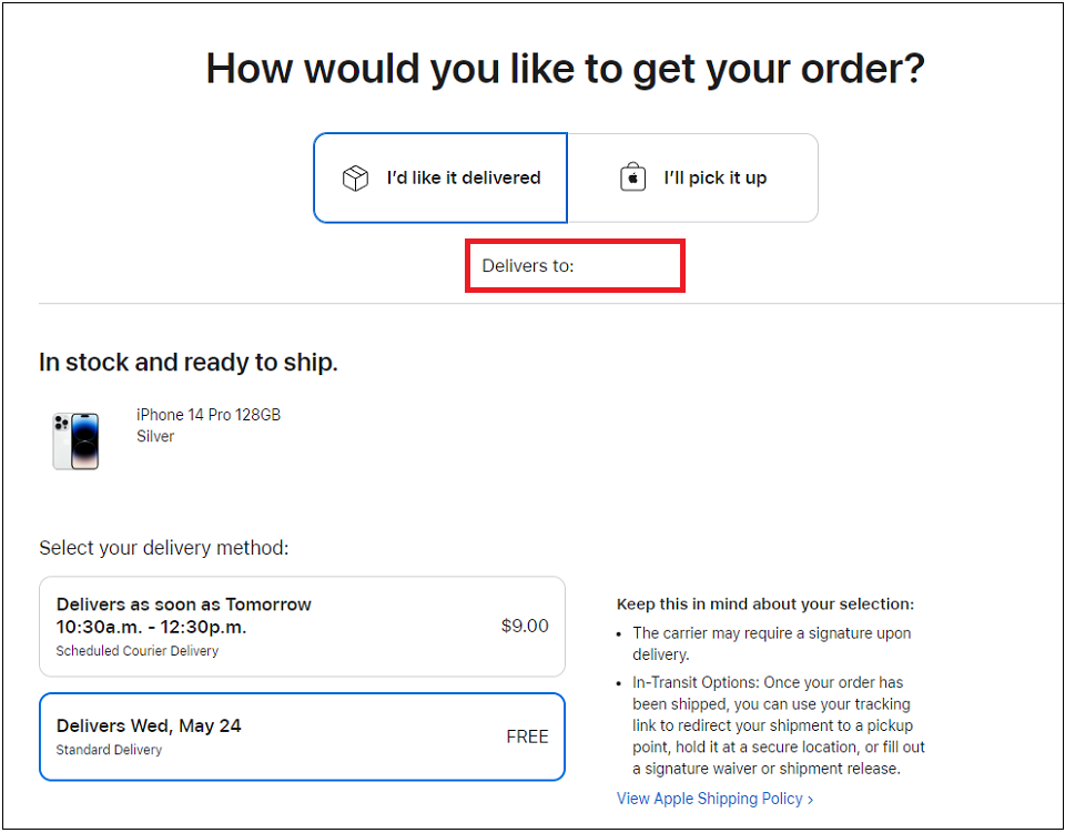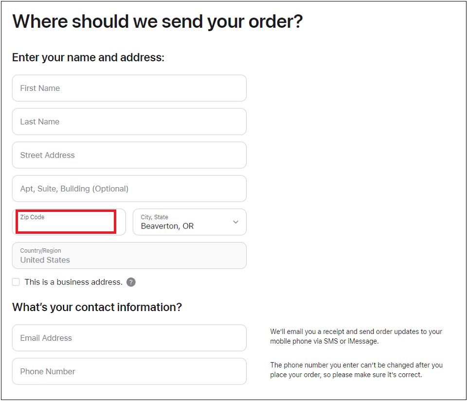 Zip Code는 이전 배송/픽업을 선택하는 단계에서