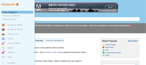 Smileys 六 People Animals & Nature Food & Drink ⚽ Activity Travel & Places Objects Symbols Flags en English Upcoming events Show more World Emoji Day Halloween Guy Fawkes Emoji List Most popular Show more ❤️ ✅ ✨ Latest news Show more 10 Years of Celebrity-Emoji Assoc...