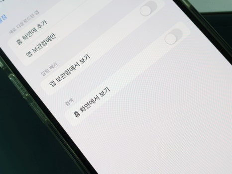 그러면 각 항목들 중에 하단에 보이는 [홈 화면에서 보기] 버튼이 있을 겁니다. 검색 아이콘을 없앨 건지 말 건지 결정하는 구간인데요.