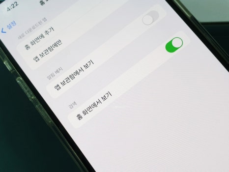 그런 다음 각 항목들 중에 아래로 드래그해서 내려가게 되면 [홈 화면 및 앱 보관함] 항목을 찾을 수 있을 거예요.