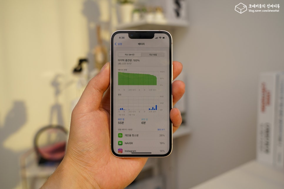 iPhone 13 mini는 절전이 된 A15 Bionic을 탑재하면서 배터리 용량이 전작의 2,227mAh에서 2,406mAh로 늘어났습니다. 라이트 한 용도로는 하루 종일 사용할 수 있었습니다만, 여유롭진 않았고요. 하드 유저라면 부족하게 느껴질 수 있으므로 보조배터리 필수입니다.