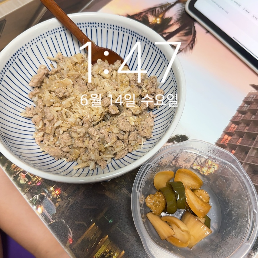 돼지고기 다짐육 150g + 다진마늘 한스푼 + 팽이버섯 반봉지 넣은 볶음밥이에요. 생각보다 양이 좀 있네요 다음번엔 반만 해도 될것같아요