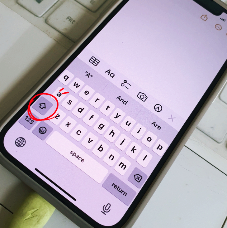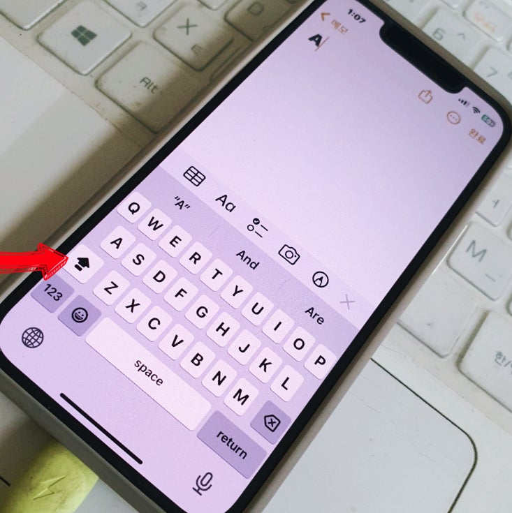 2. 아이폰 키보드 왼쪽 화살표 더블터치 합니다.