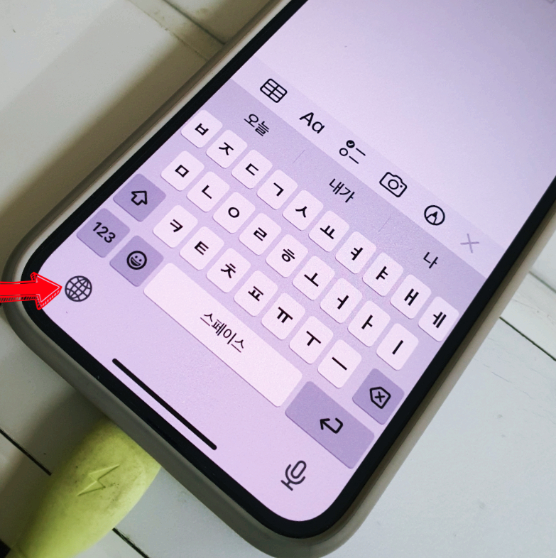 먼저 키보드를 활성화하면 한글이 보여집니다. 그럼 아래 지구본 모양을 터치해 영문으로 바꿔 줍니다.