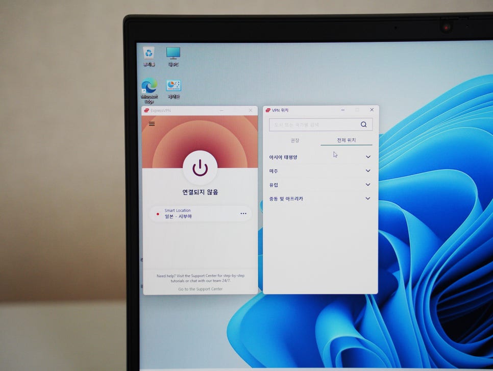 실제 소프트웨어 설치 후 실행한 모습입니다. 먼저 윈도우11 환경에서 다운로드를 했어요. 현재 연결 상태와 더불어 우측 팝업에서는 원하는 위치를 고를 수 있습니다. 대표적으로 많이 사용하는 권장 위치와 태평양, 미주, 유럽, 아프리카와 중동 등 전체 위치까지 선택 가능합니다. 총 94개국 서버 위치가 있으니 필요에 따라 접속하면 됩니다.