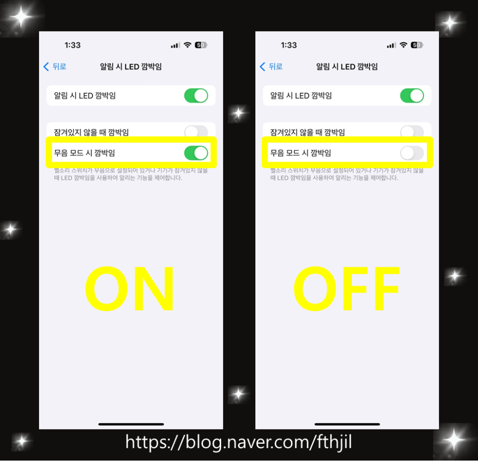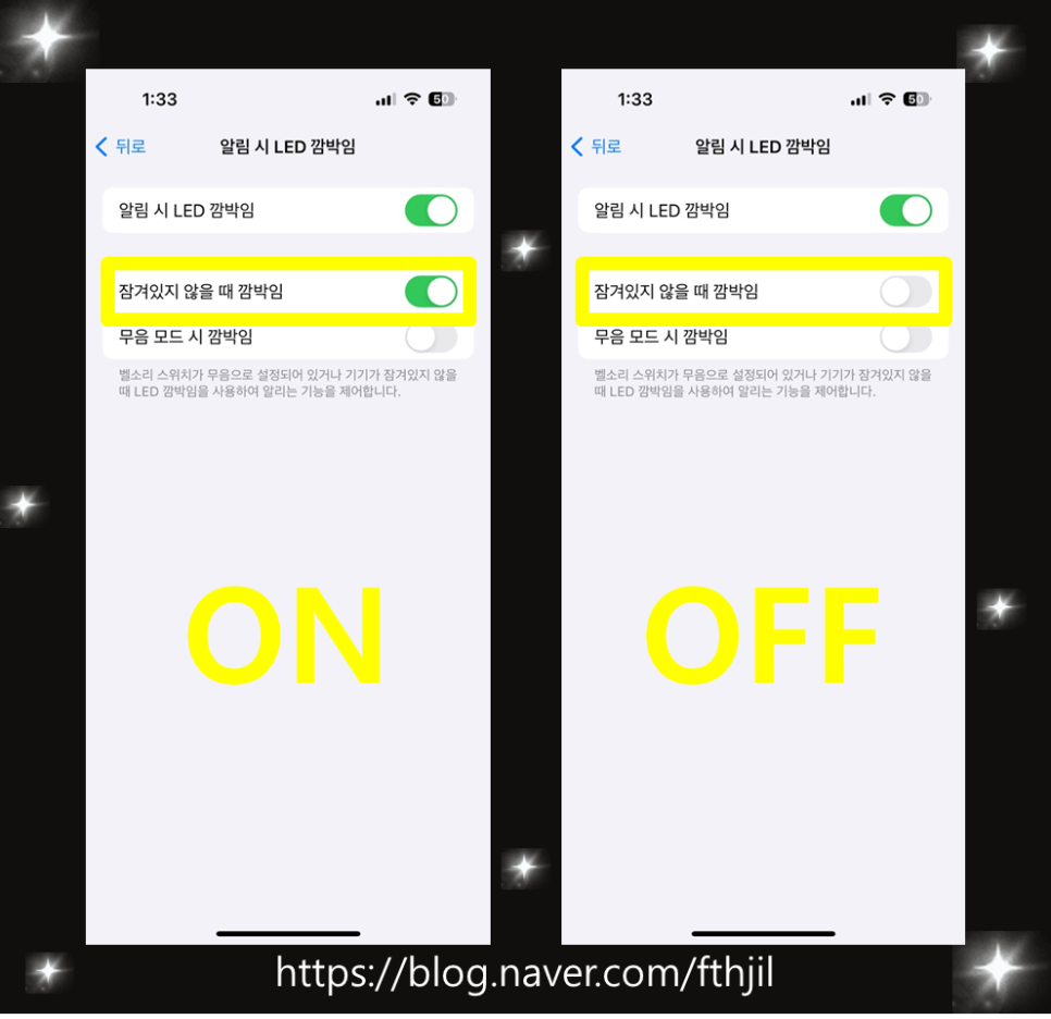 5. 알림 시 LED 깜박임 토글을 켜주세요 (초록색 = ON)