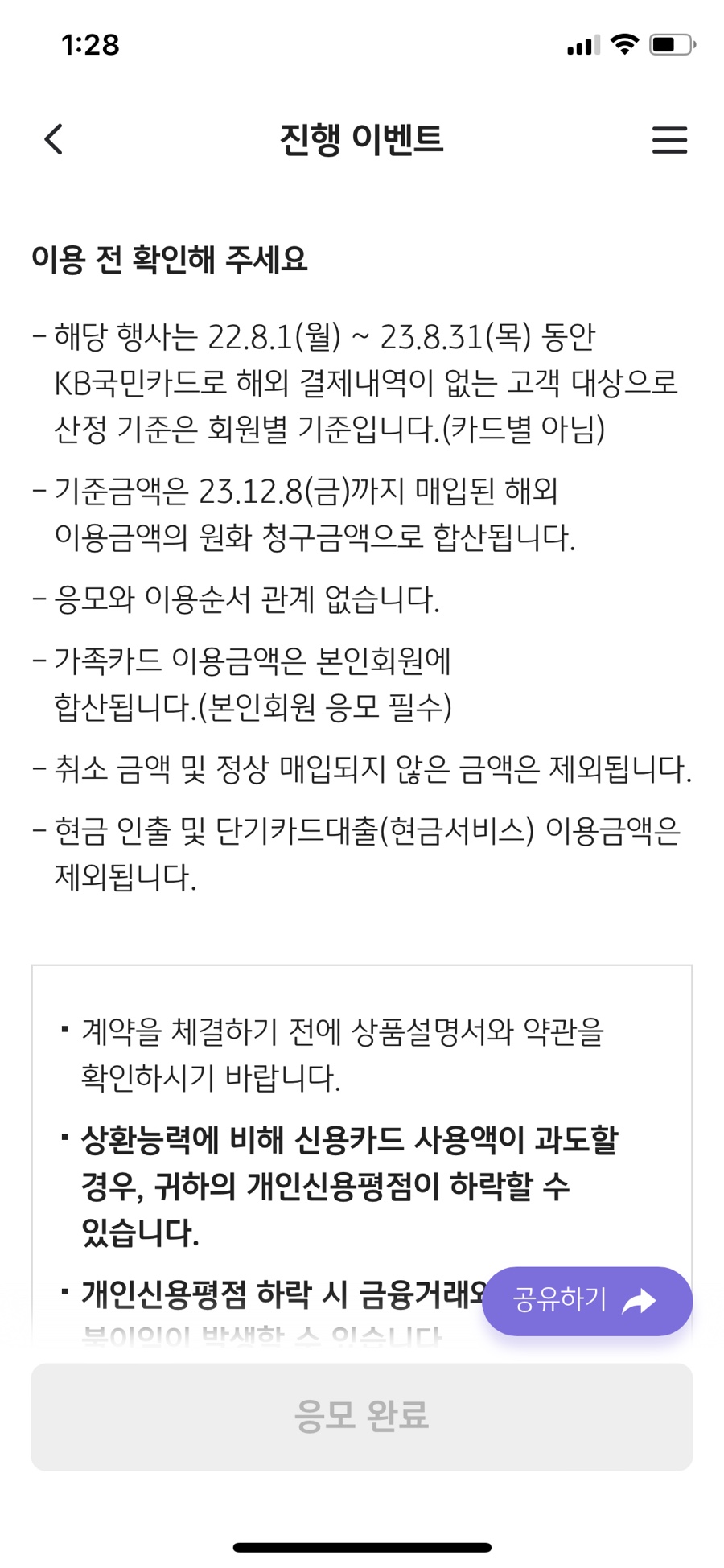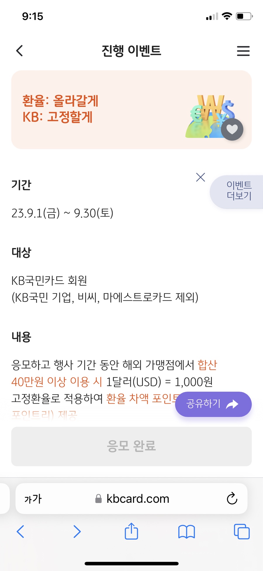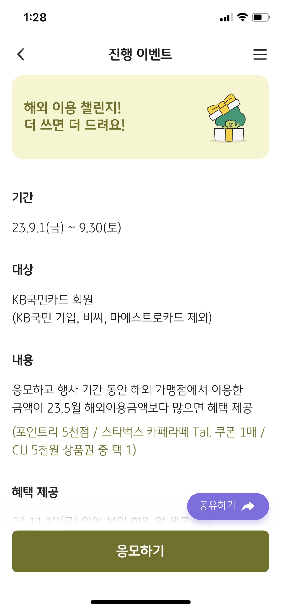 내가 현재 이용중인 카드사이벤트 중에서는 국민 카드 할인이 가장 나은 거 같아 국민 카드로 결정함!