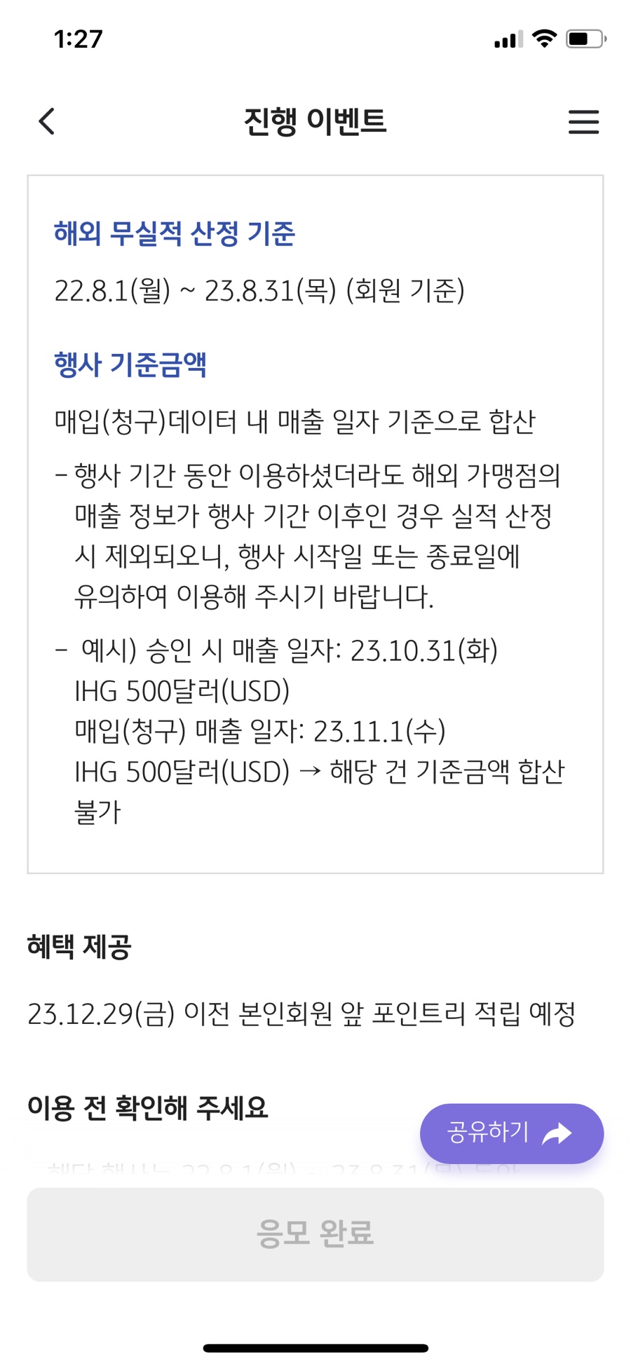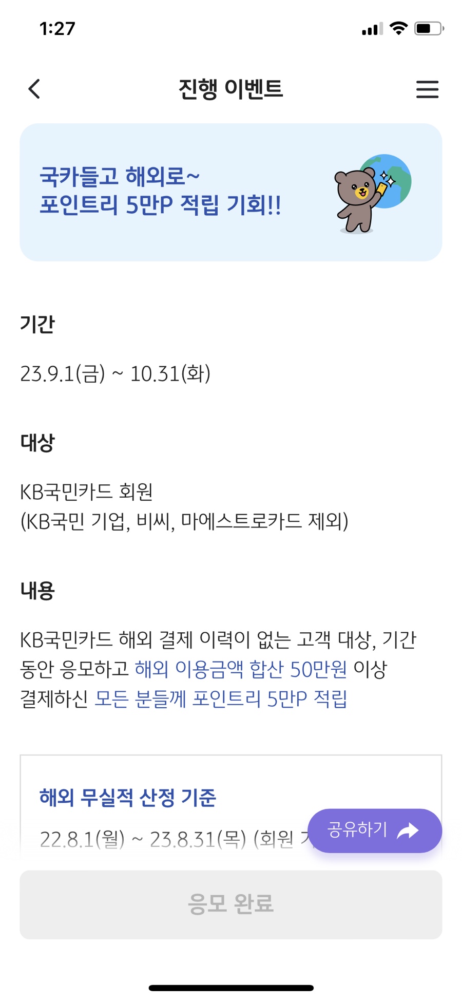 두번째- 해외 이용금액 50만원 이상시 5만P 적립