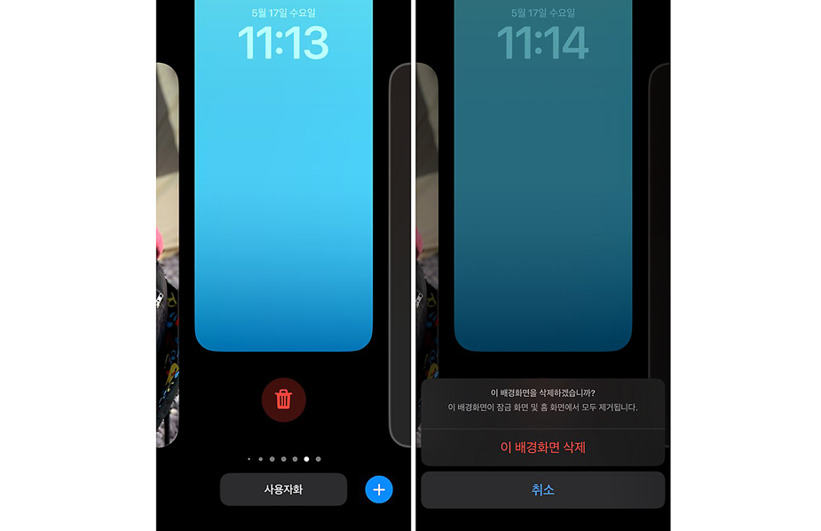 아이폰 배경화면 사용자화 삭제 방법은 잠금화면을 선택, 위쪽으로 스크롤한뒤 휴지통을 탭하여 삭제하면 돼요.