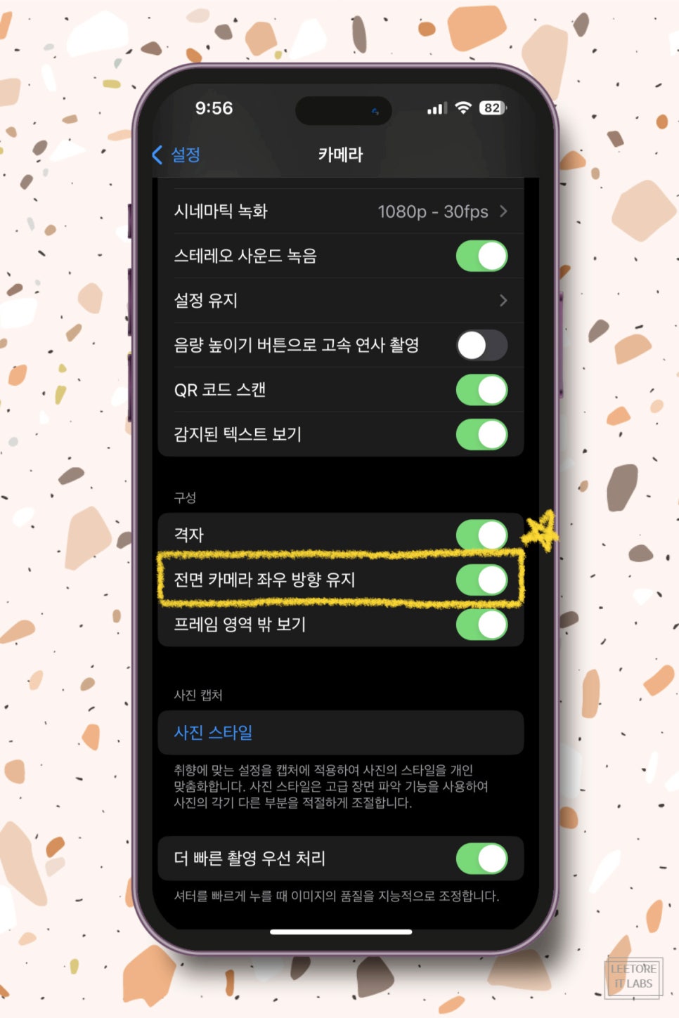 <카메라> 메뉴에서 아래로 스와이프 해보면 <전면 카메라 좌우 방향 유지>라는 항목 오른쪽에 토글 키가 OFF로 꺼져있는 것을 확인할 수 있습니다. 탭 해서 스위칭하여 토글키를 활성화해주시면 됩니다.