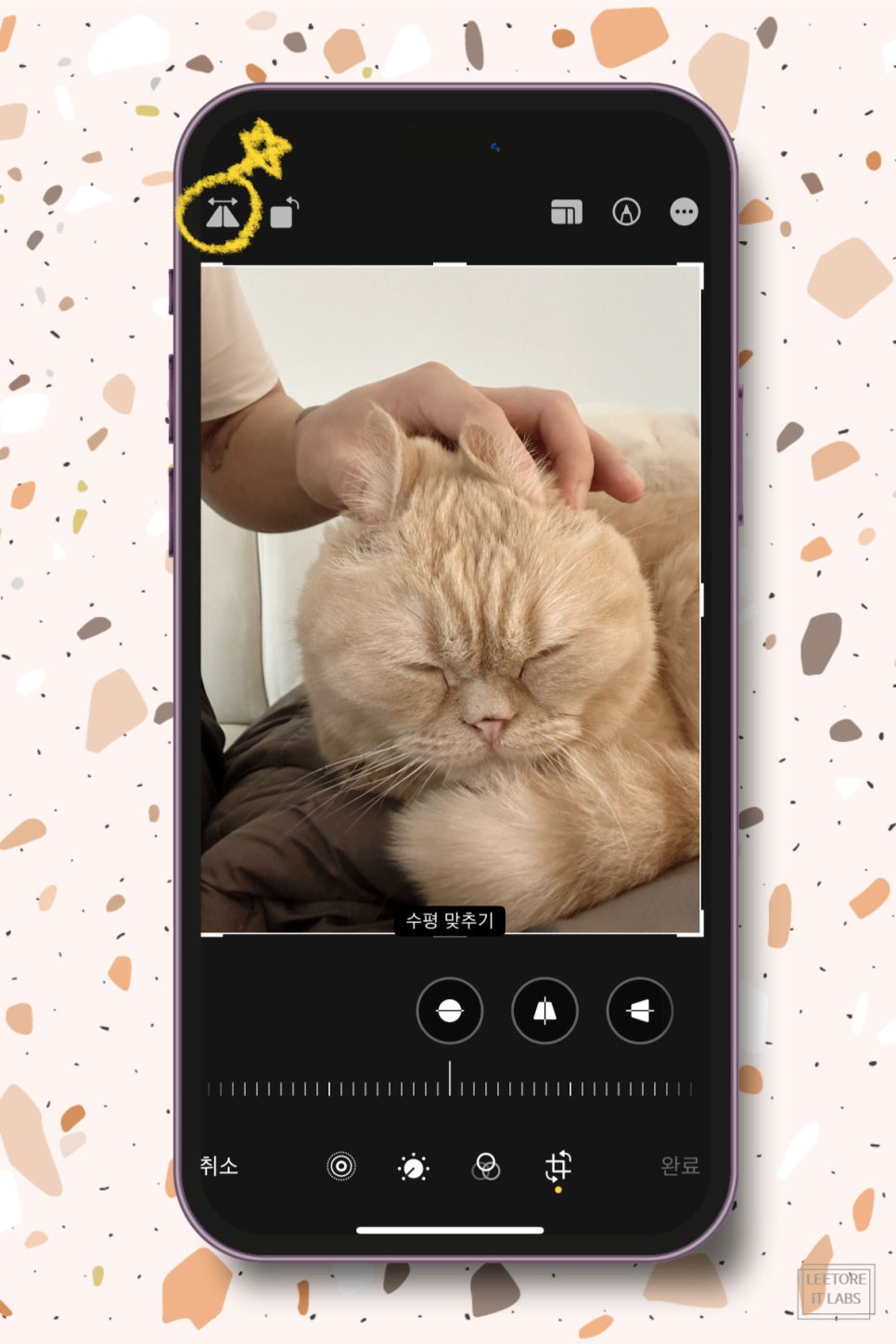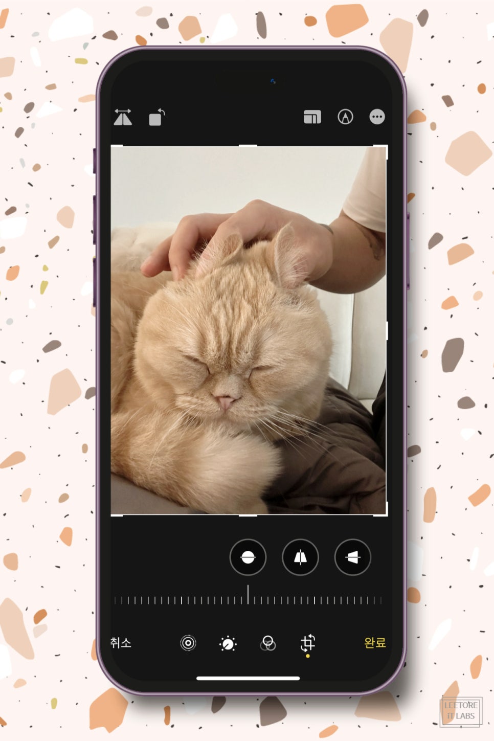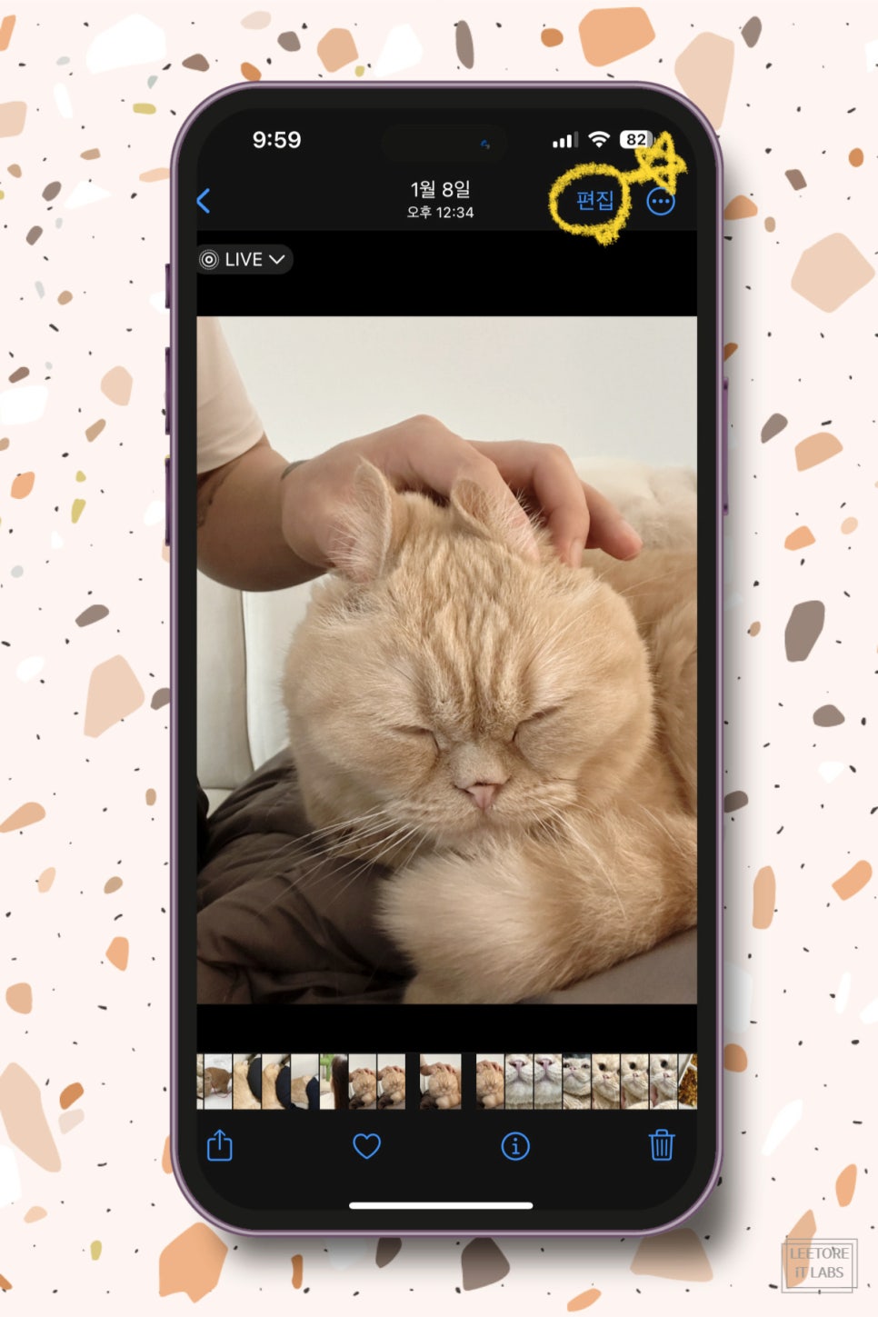 앨범에서 원하는 사진을 선택하신 후에 오른쪽 상단에 <편집>을 눌러주세요. 그러면 아래에 4가지 아이콘이 보일 텐데 그중에서 오른쪽에 있는 표시된 아이콘을 눌러보도록 하겠습니다.