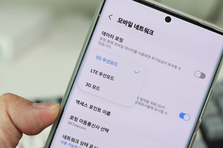갤럭시도 3가지 모드가 있습니다. 5G에서 4G로 변경을 하는 경우 [LTE 우선 모드]로 선택을 하면 됩니다.