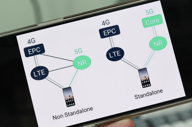 한국의 5G 서비스는 SA라 불리는 스탠드얼론이 아닙니다. N-SA 논스탠드얼론 방식에 해당하는데요. 핸드폰에는 오지 통신망으로 연결이 되어 있지만