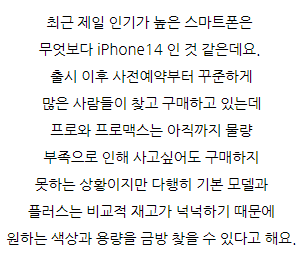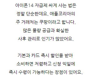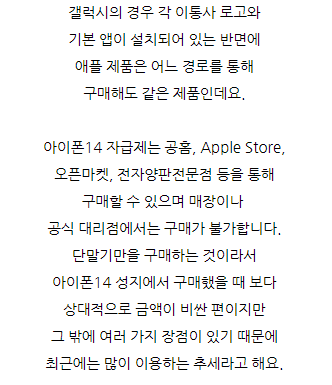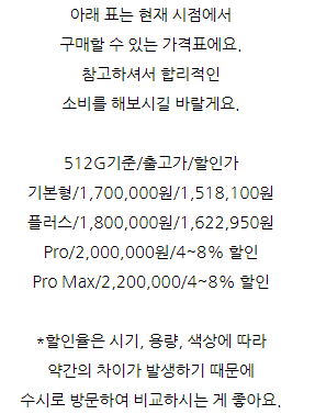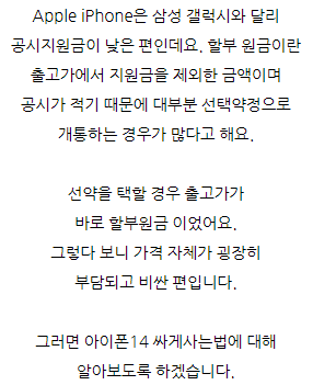 오늘은 아이폰14 종류 크기 비교 스펙에 대해 정리해드리도록 하겠습니다. 아이폰 14 시리즈의 라인업 구성은 14, 14 plus, 14 pro, 14 pro max입니다. 전작인 아이폰13 시리즈와 마찬가지로 PRO와 일반 모델의 프로세서 급 차이를 나누고 있으며 프로 경우 노치가 제외된 디자인을 선택했지만 일반 모델의 경우 여전히 화면 상단의 노치를 유지하고 있더라고요. 아이폰14 128GB 125만원, 256GB 140만원, 512GB 170만원 출고가로 구성되어 있고 13 PRO에 내장되어 있는 GPU 5코어 구성에 A15 Bionic Chip이 내장되어 있고 더 나아가 위성 GPS를 통해 충돌 감지 시 긴급 알림을 알려주는 기능까지 내장되어 있었어요. 디스플레이는 전작과 동일하게 해상도와 밝기를 지원하며 PRO 경우 펀치홀이 장착되어 있으며 작동하고는 앱에 맞춰 정보량을 표시하는 Dynamic Island 기능이 있더라고요. 14는 13과 동일한 노치 전면 카메라였어요. 시네마틱 모드는 4K 30fps까지 촬영할 수 있으며 액션모드가 추가되어 보다 안정적인 촬영이 가능하고 전반적인 주간 및 야간 촬영 성능이 전작 대비 약 2~2.5배 상승했지만 라이트닝 포트 2.0으로 데이터 전송 속도는 느린편이라고 합니다. 아이폰14 플러스 128GB 135만원, 256GB 150만원, 512GB 180만원 출고가 구성으로 13 미니가 단종되고 새롭게 14에 추가된 모델인데요. 14와 동일한 A15 Bionic Chip이 장착되고 14 PRO MAX와 동일한 사이즈를 가지고 있었어요. 6.7인치라는 큰 디스플레이 사이즈와 203g이라는 무게를 제외하면 14와 큰 차이점이 없고 폼팩터 크기에 따라 배터리 사용 시간 및 스피커 음량에 차이가 있었어요. 적당한 스펙의 큰 Display를 원하시는 분들께서는 14 중 14 플러스가 가장 적당해 보입니다. 아이폰 14 프로 128GB 155만원, 256GB 170만원, 512GB 200만원, 1TB 230만원 출고가 구성으로 애플 최초로 펀치홀 카메라가 적용된 디바이스라고 합니다. 사용자의 앱에 맞춰 정보를 제공하는 Dynamic Island 기능이 추가되었으며 동시에 HDR 기준 2,000니트 밝기를 지원하고 있더라고요. 일반 기종과 다르게 A16 Bionic Chip이 장착되어 있고 이는 높은 프로세서이며 camera 시스템 또한 굉장히 뛰어나며 48MP 메인 광각 렌즈를 통해 전자 대비 약 2~3배 가량 상승된 카메라 성능을 느껴볼 수 있다고 합니다. 뿐만 아니라 시네마틱 모드는 4K 30fps HDR 촬영, 돌비 비전 방식은 4K 60fps 촬영이 가능하고 OIS 성능을 극대화한 액션 모드를 추가했다고 해요. 배터리 용량과 camera 센서가 증가했지만 무게는 조금 증가했으며 여전히 6.1인치 스마트폰 규격에서 206g이라는 무게는 부담스러울 수 있어요. 포트는 2.0 라이트닝, ProRes 코덱, 돌비 비전 HDR, 시네마틱 4K 등 고용량 camera 시스템을 갖추고 있었습니다. 아이폰14 프로 맥스 128GB 175만원, 256GB 190만원, 512GB 220만원, 1TB 250만원 출고가 구성으로 프로와 동일한 시스템을 갖추고 있었는데요. 폼팩터 크기에 따른 배터리 라이프 및 스피커 음량에 차이가 있으며 6.7인치라는 큰 display와 프로모션 기능을 토대로 14 중 가장 뛰어난 사용성을 제공하고 있다고 합니다. 그러나 14 시리즈 가운데 가장 무거운 240g으로 갤럭시 폴드4와 약 20g밖에 차이가 나지 않으며 이에 따라 구매 전에 무게에 대해 꼼꼼히 확인해 보시는 걸 추천합니다. 아이폰 14 시리즈 스펙정리 가격이 높아진 만큼 고민인 분들께서는 할인 정보를 알아보고 있는데요. 저렴하게 구매하는 방법을 소개해드리자면 대체적으로 공시지원금이 낮은 아이폰의 경우 기기값 할인을 받고 구매하기 위해서는 휴대폰 성지 공유 카페를 이용하시는 게 좋은데요. 스마트폰을 저렴하게 구입하기 위해서는 자체 보조금을 추가로 지원하는 휴대폰 공유 카페를 이용하는 게 좋고 성지에서는 30~70만원 더 지원이 가능하므로 출고가가 높은 아이폰도 저렴하게 구매할 수 있어요. 온라인 CAFE에서 성지의 시세와 좌표 정보 모두 공유 받을 수 있으니 참고하시면 도움이 될 것 같습니다. 아이폰14시세 알아보기 자체 보조금 혜택 30~70만원 더 받고 저렴하게 개통하시길 바랍니다! 아이폰14 종류 크기 비교 스펙에 대해서 말씀드렸습니다.