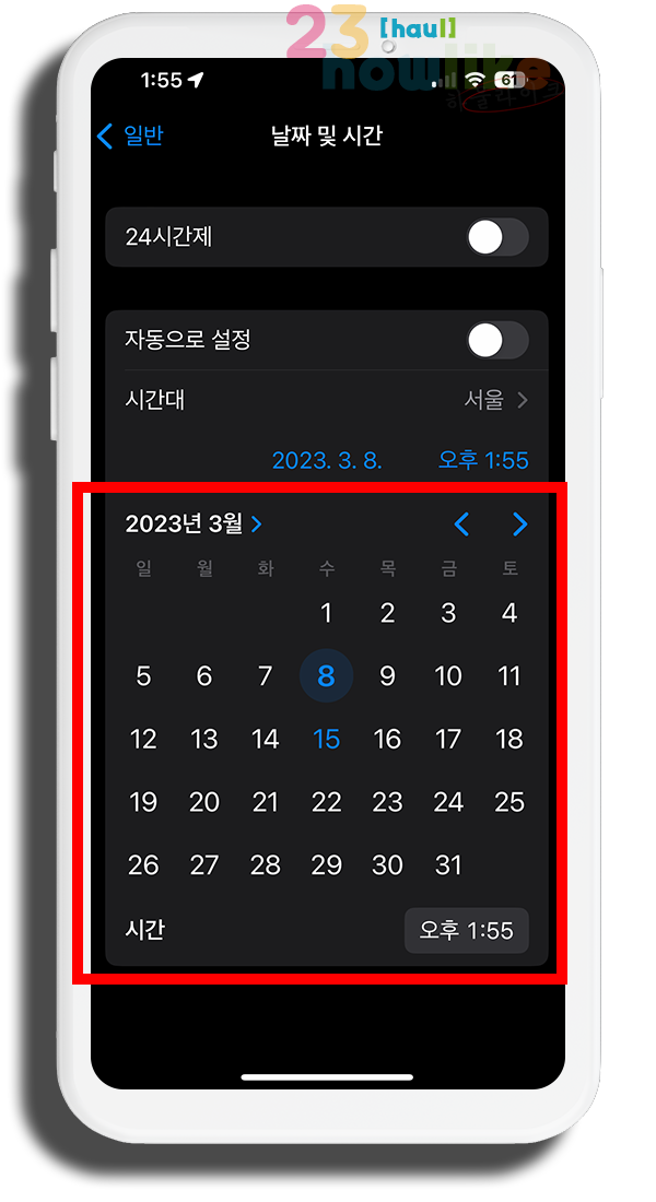 날짜 및 시간을 선택하면 자동으로 설정이라고 체크가 되어있습니다. 이걸 꺼주면 바로 시간을 원하는 대로 변경할 수 있습니다.