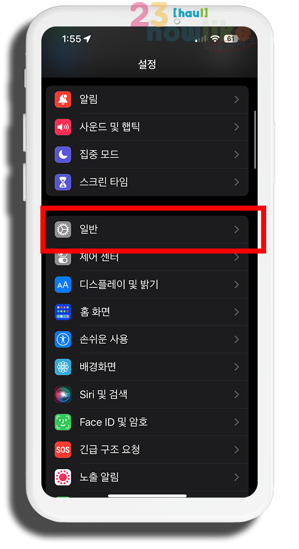 아이폰의 설정 앱에서 일반 항목을 클릭합니다.