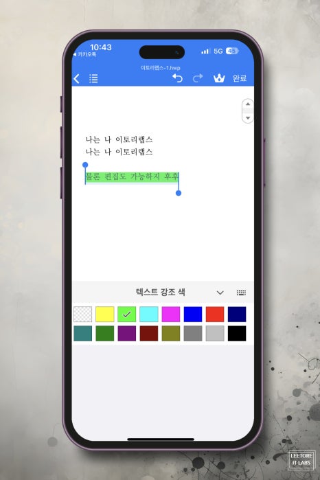 한글 파일을 간단하게 공유를 통해 열 수 있으며 우측 상단에 <편집> 텍스트를 누르면 기존에 작성된 문서를 수정하거나 편집도 가능하다. 수정을 마무리한 뒤에는 다시 우측 상단에 <완료> 버튼을 누르면 저장이 된다.
