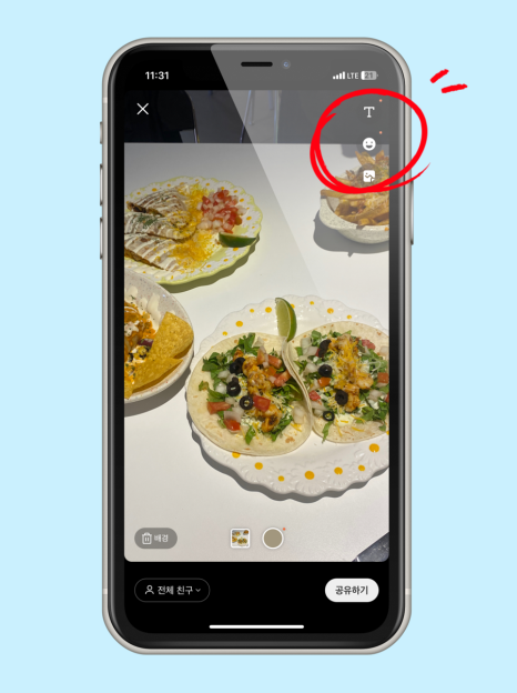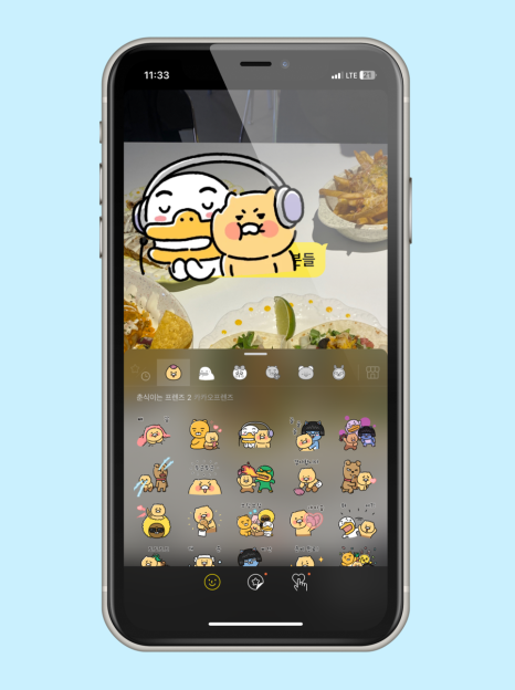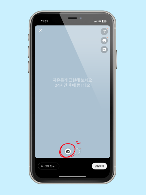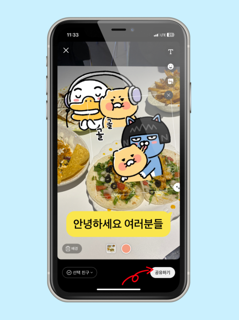 배경사진을 추가했다면 우측 상단에 <T> 텍스트 기능을 통해서 하고 싶은 말을 쓸 수도 있으며, 이모티콘도 사용할 수 있습니다.