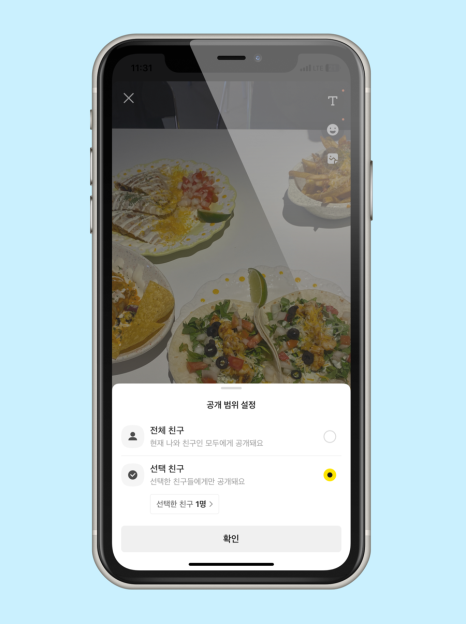 다 마무리하셨다면 아래에 <전체 친구 OR 선택 친구>를 설정하여 자신이 보여주고 싶은 사람들에게만 보여줄 수 있도록 설정도 할 수 있습니다.