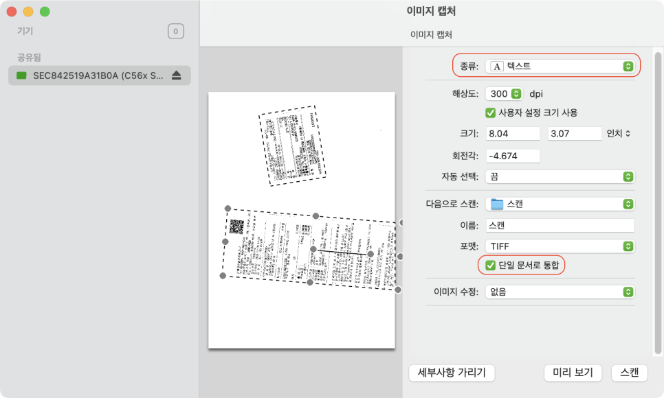 예를 들어 영수증을 스캔할 때