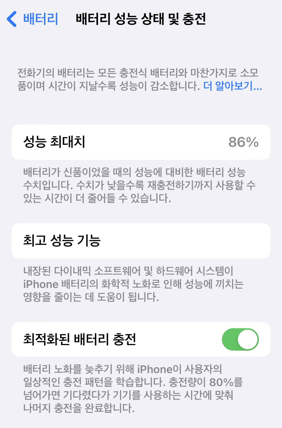 저는 86% 상태에서 교체했습니다. 86%가 반년 동안 지속되던데 날이 갈수록 배터리가 빠르게 소모되는 것이 체감되었었습니다. 보통 80% 중반쯤 되면 교체하는 것을 추천하더라고요.