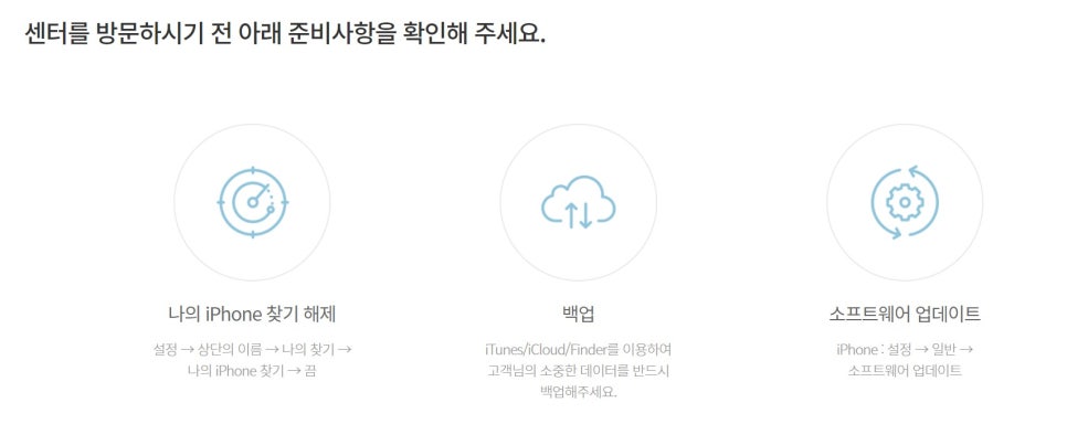 위 두 가지 사항은 센터 측에서 꼭 물어봅니다. 어차피 아이폰이 하루에 1번 이상 자동으로 백업하긴 하지만, 오랫동안 백업이 안 돼있으면 수리 거부될 수도 있습니다.