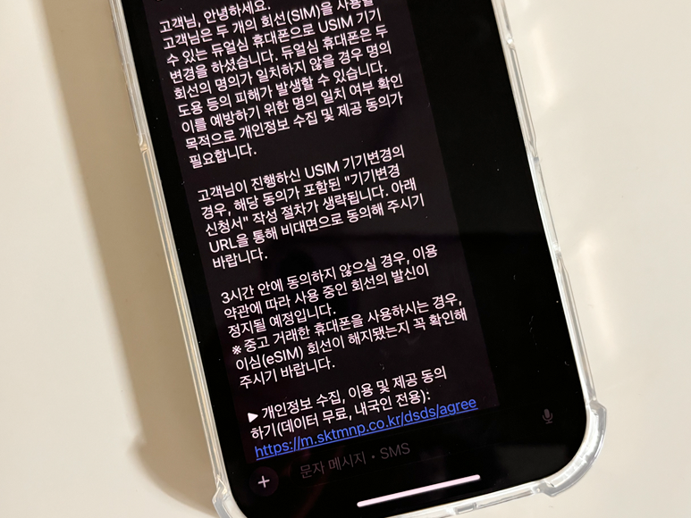 7. 문자로도 기기 변경이 완료되었다는 메시지를 받을 수 있습니다. 상황에 따라 전송되는 URL을 통해 개인정보 수집 및 제공 동의를 해주어야 합니다. 3시간 안에 동의하지 않으면 회선의 발신이 정지될 수 있다고 합니다.