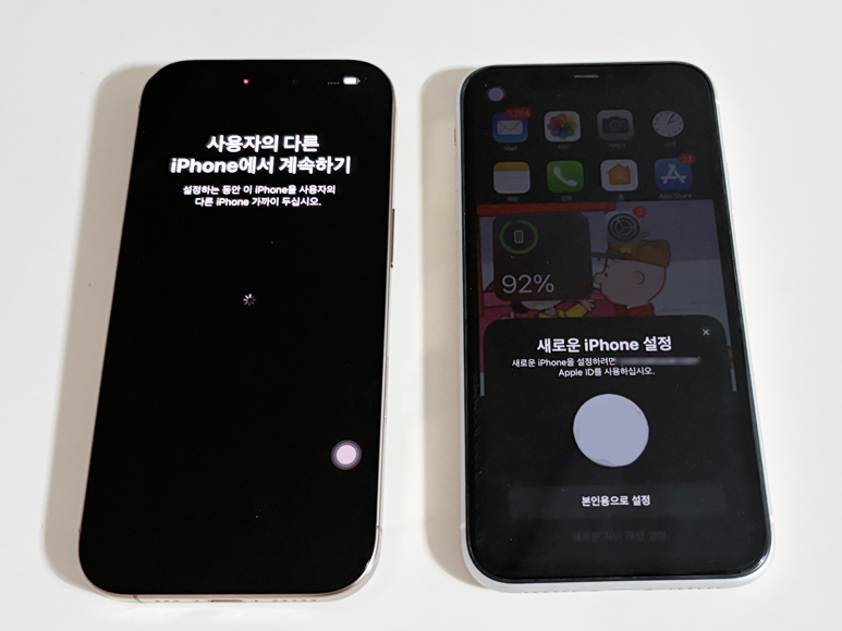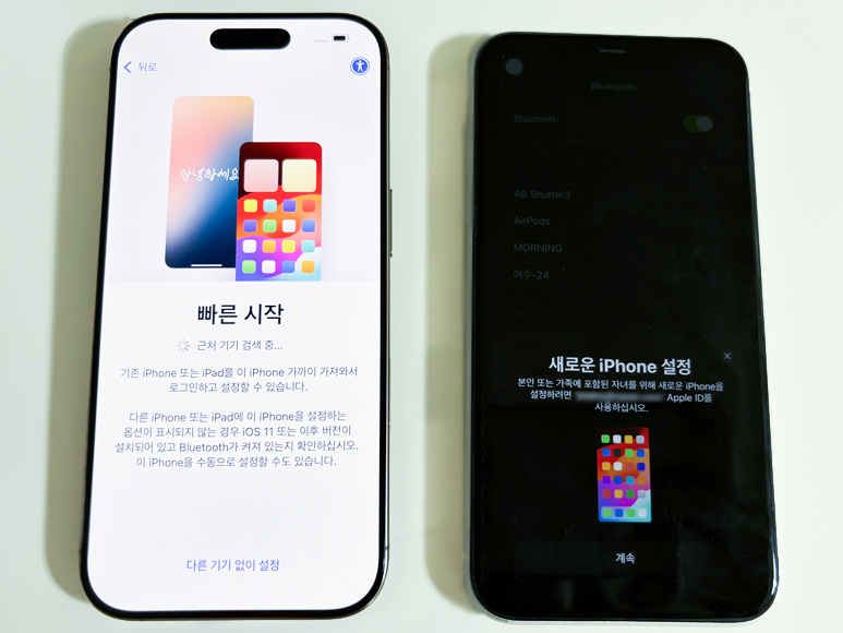 1. 새로운 폰에서 언어 설정을 마치면 '빠른 시작' 화면이 나옵니다. 반면 기존 폰에서는 '새로운 iPhone 설정'이라는 창이 뜨는데 진행을 위해 '계속' 버튼을 눌러줍니다. 만약 창이 뜨지 않는다면 블루투스가 켜져 있는지, iOS 11 이후 버전이 설치되어 있는지 체크해 보셔야 합니다.