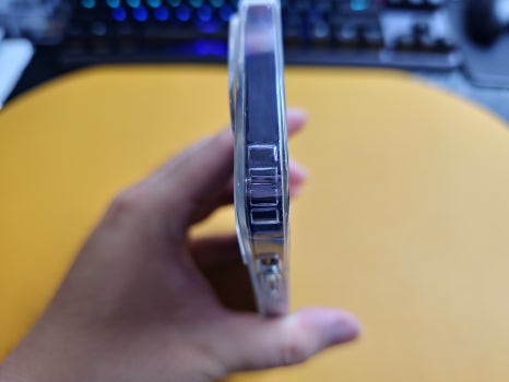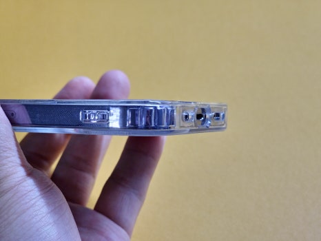 옆면에는 하드 PC + 가운데에는 소프트 TPU 소재인 하이브리드 케이스로, 후면에는 맥세이프가 적용되어 있습니다. 투명 케이스에 주로 적용되는 도트 패턴이 아닌, 고급 TPU 원료가 들어가 사용하는 데 있어서 변색에 강하다고 합니다.