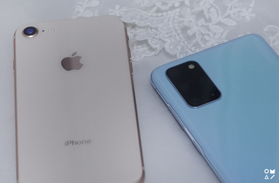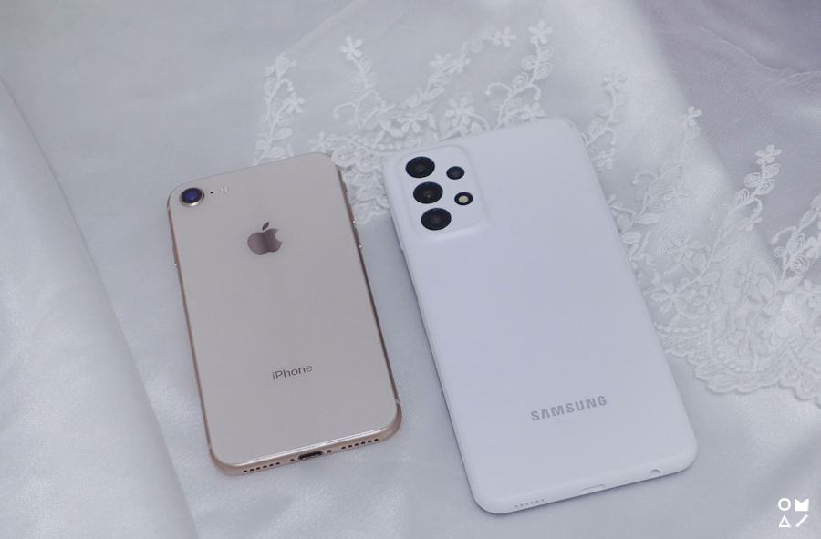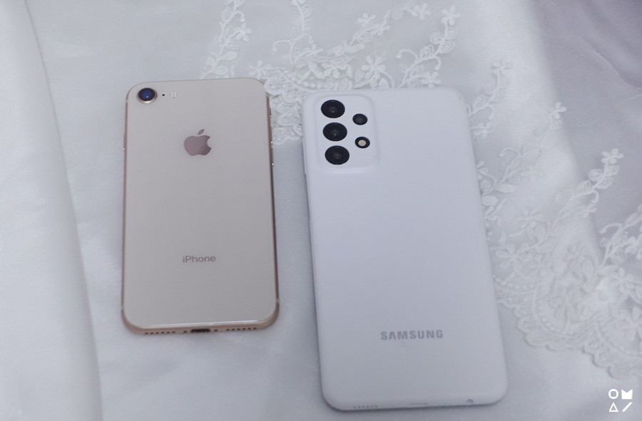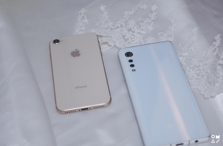 오른쪽에 위치하고있는 갤럭시 보급형 같은 경우에는 화이트톤으로 꽤 아름답다는 생각이 들었는데 아무래도 아이폰8이 보급형으로 나온 스타일이 아니기때문에 퀄리티가 더 괜찮아보였습니다.