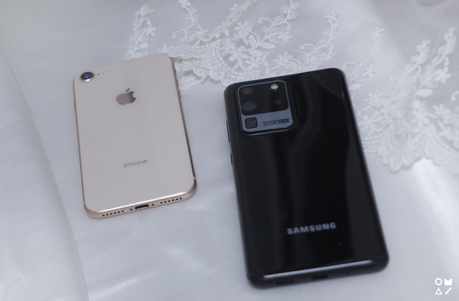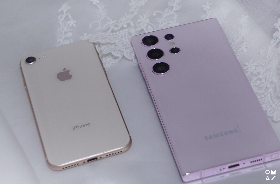 오른쪽에 위치한 모델은 갤럭시이며 어두운 갤럭시 컬러보다는 저는 밝은 스타일의 아이폰을 더 선호하기때문에 왼쪽이 더 마음에 든다고 말씀을 드릴 수가 있었습니다.