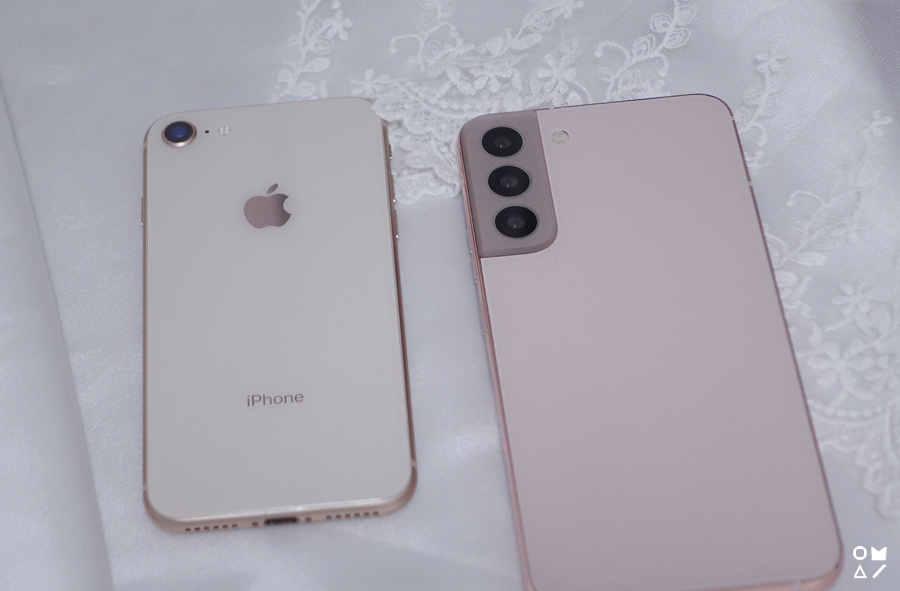 오른쪽에 위치한 휴대폰은 갤럭시 핑크이며 이 갤럭시와 다른 아이폰의 로즈골드는 더욱 더 러블리함과 여리함이 있어서 이 스타일의 휴대폰 색감을 선호하시는 분들께서 좋아하실 것 같습니다.