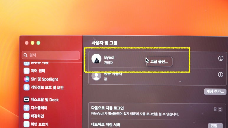 아까와 같이 [시스템 환경설정]으로 진입해 줍니다. 중앙에 보이는 [사용자 및 그룹]으로 들어가게 되면 위와 같은 화면이 보일 텐데요. 변경하고자하는 계정을 마우스 우클릭한 뒤, [고급 옵션]을 눌러줍니다. 잠금 해제를 필수적으로 해야 합니다. 암호는 애플 ID가 아닌 컴퓨터 보안 번호입니다.