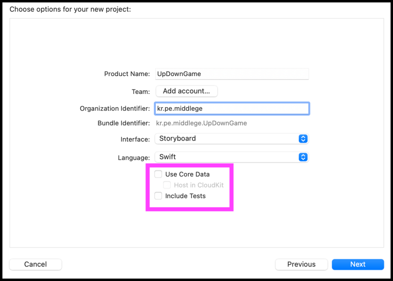 이렇게 "Organization Identifier"을 입력하면 아래에 "Bundle Identifier"은 자동으로 생성된다.