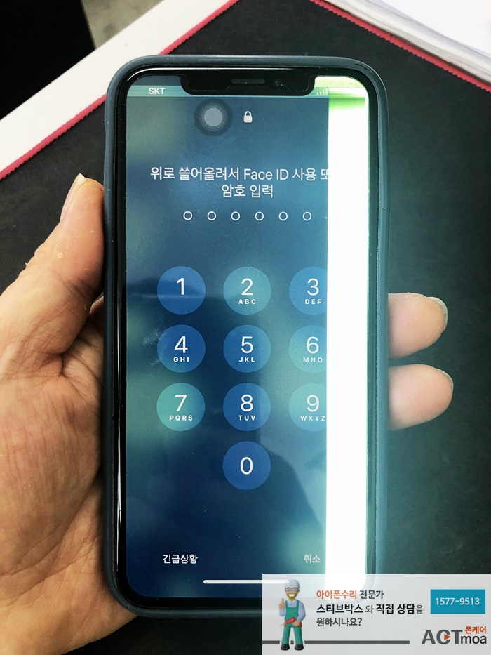 오늘은 아이폰XS의 액정 충격으로 인하여 내부손상이 되어 녹색줄이 세로로 생기는 현상으로 불편함을 해결하는 셀프수리 방법을 알아보도록 하려고 하는데요, 화면에 줄무늬가 보이면 터치에 문제가 발생할수 있으므로 가능한 설정에서 암호끄기를 하여 비활성을 방지하고 사용하는 것이 좋은 방법입니다