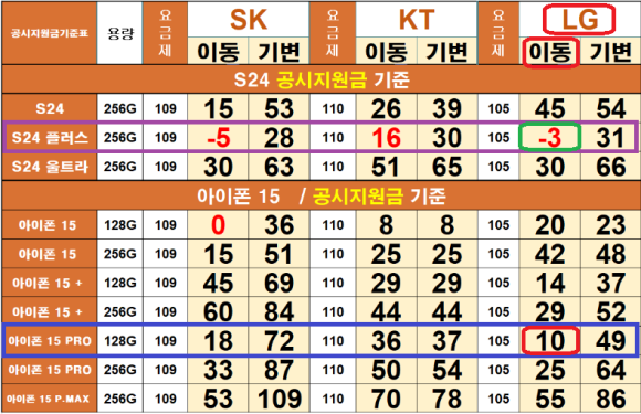 만약 아이폰 15 프로 128 기가를 KT, SK에서 LG로 옮기는 번호이동으로 개통시 10만 원이고, 갤럭시 S24 플러스 256 기가도 동일한 조건으로 구매할 때 -3으로 기기값은 없으며, 3만 원을 캐시페이백 받을 수 있다는 뜻으로 공짜폰도 가능합니다.