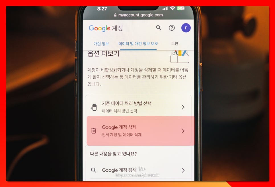 해당 메뉴는 저장되어 있는 데이터 및 다른 사용자 공유 정보 혹은 개인 정보에 대한 탭으로, 아이폰 구글 계정 삭제 또한 이곳에서 진행합니다.